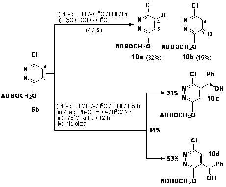 Folosirea a 3 echivalenti LTMP/ EtOD conduce la disparitia, aproape in totalitate, a dubletului corespunzator protonului H-4, in timp ce dubletul corespunzator protonului H-5, din compusul 13, devine singlet in derivatul deuterat 13-d (Figura 3). Astfel, putem vorbii de o regioselectivitate absoluta de 93% la C-4 si de o regioselectivitate relativa de 100% in piridazina.