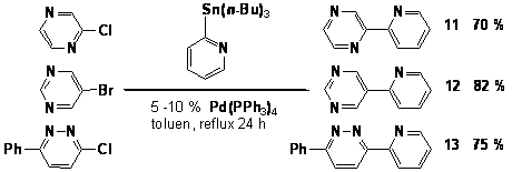In scopul studierii reactiilor de metalare si functionalizare a diazinelor ne-am propus sa analizam rolul gruparii 2-piridil ca si grupa orto-directoare. Astfel, au fost sintetizati compusii 11-13, utilizand conditiile de cuplaj Stille (Schema 13).15