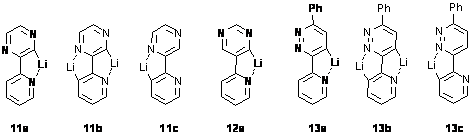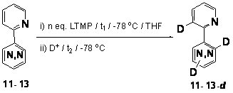 Deoarece incorporarea deuteriului a fost mai semnificativa in inelul diazinic, s-a tras concluzia ca gruparea 2-piridil este o GOD mai buna decat diazinele, in accord cu procentele prezentate in Tabelul 1: regioselectivitatea globala ~ 7:1 in 12-d, ~4:7 in 13-d si ~4:1 in 11-d. Aceste rezultate pot fi explicate prin mai buna stabilizare a intermediarilor litaiati corespunzatori complexarii litiului de catre azotul piridinic, mult mai bazic decat cei diazinici (Schema 15).