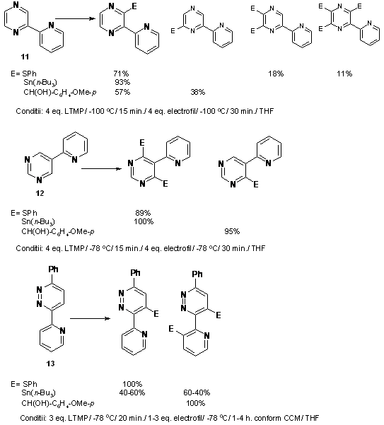 Aceste rezulate au fost utlizate, in continuare, pentru functionalizarea 2-piridildiazinelor 11-13 cu trei electrofili tipici: Ph2S2, ClSn(n-Bu)3 si p-MeO-C6H4-CHO (Schema 16).