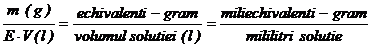 unde : m(g) este masa substantei dizolvate in solutie, in grame ; V(l) – volumul solutie, in litri(l) ; E – echivalentul chimic al substantei dizolvate.