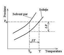 Aceasta comportare rezulta īn mod intuitiv din reprezentarea grafica a presiunilor de vapori, ale solventului pur si a solutiei, functie de temperatura, cānd se obtin cele doua curbe reprezentate īn figura 6.2: