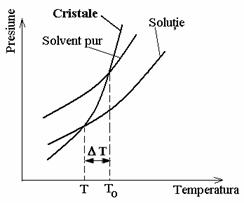 Pentru a arata acest lucru, īn figura 6. 3. s-au reprezentat curbele presiunilor de vapori ale solventului pur, ale solventului din solutie - care contine dizolvata o substanta practic nevolatila - si ale cristalelor solventului.