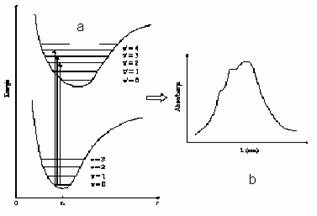 Deoarece tranzitia electronica este rapida, iar starea excitata are un timp de viata foarte scurt (10-6-10-9 s), conform principiului Franck-Condon se considera ca molecula va avea in timpul absorbtiei radiatiei aceeasi configuratie (distante internucleare nemodificate) si aceeasi energie cinetica de vibratie, atat in starea fundamentala cat si in starea excitata. In figura 2.1a sunt redate curbele Morse (reprezentari grafice ale energiei potentiale in functie de distanta interatomica) pentru doua stari electronice ale unei molecule biatomice; in aceasta diagrama a starilor electronice, tranzitiile electronice posibile sunt reprezentate prin linii verticale. In timpul tranzitiei electronice nu actioneaza nici o regula de selectie generala restrictiva privind modificarea starii de vibratie. Tranzitiile electronice pot avea loc intre starea vibrationala fundamentala (v=0) a starii electronice fundamentale si diferite stari de vibratie excitate (v'=1, v'=2, etc) ale unei anumite stari electronice excitate. Aceste tranzitii pot conduce la o structura fina de vibratie a benzii electronice de absorbtie (figura 2.1b). In cazul tranzitiilor electronice care se petrec intre orbitali moleculari de legatura si orbitali moleculari de antilegatura, curba energiei potentiale pentru starea fundamentala este diferita de cea a starii excitate datorita unei densitati electronice de legatura mai scazute in starea excitata. Ca rezultat, distanta de echilibru internucleara va fi mai mare, iar curba energiei potentiale va fi mai larga pentru starea excitata. Datorita acestei deplasari a curbei energiei potentiale a starii excitate, tranzitiile electronice vor avea loc spre stari de vibratie caracterizate de numere cuantice mai mari ale starii electronice excitate.