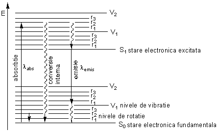 In figura 2.13 sunt prezentate schematic tranzitiile care pot avea loc sub actiunea unei cuante de radiatie electromagnetica, intre stari electronice caracterizate de diferite nivele energetice vibrationale ale unei molecule. In fenomenele de fosforescenta si fluorescenta procesele de relaxare (revenire la starea fundamentala) au loc prin emisie de radiatie electromagnetica. Daca in urma absorbtiei de energie, tranzitiile electronice au loc spre nivelele de vibratie superioare ale orbitalilor moleculari LUMO, atunci intr-un timp foarte scurt (de ordinul picosecundelor) poate avea loc mai intai un fenomen de relaxare prin conversie interna (proces non radiativ), conducand in starea de vibratie cea mai joasa a acestei stari electronice. Din aceasta stare energetica, prin emisia de cuante de radiatie electromagnetica poate avea loc relaxarea in continuare spre diferite stari de vibratie ale starii fundamentale; radiatiile emise astfel, numite radiatii de fluorescenta, sunt caracterizate de lungimi de unda mai mari decat cele absorbite. Toate aceste tranzitii electronice au loc cu conservarea multiplicitatii de spin electronice intre stari singlet (in care electronii au doi cate doi spin opus-sunt imperecheati).