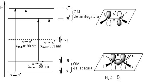 -un electron din cele doua perechi de electroni neparticipanti la legaturi ai atomului de oxigen (n) poate fi promovat dintr-un orbital atomic intr-un orbital molecular de antilegatura π* (tranzitie n→π*).