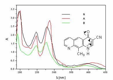 In figura 2.15 sunt prezentate modificarile care apar in pozitiile benzilor de absorbtie ale 3-ciano-10-metil-pirido[3,2-g]chinolinei in solutie apoasa neutra, acida si respectiv bazica.