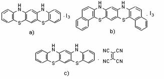 In figura 2.16 sunt prezentate spectrele UV-Viz ale complecsilor de transfer de sarcina dintre molecule electrono-donoare cu structura fenotiazinica si moleculele electrono-acceptoare TCNE, iod. Banda de absorbtie datorata complexului de transfer de sarcina apare in domeniul vizibil.