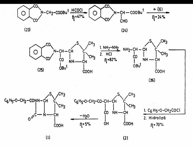 Formilarea derivatului ftalinidic (23) se face in mediu anhidru, iar ftalimidoaldehida (24) rezultata se condenseaza, in mediu de etanol, cu D-penicilamina, formand esterul t-butiric (25) care prim hidroliza cu hidrazina in prezenta HCl, trece in derivatul (26), iar acesta prin condensare cu clorura acidului fenoxiacetic si hidroliza ulterioara a esterului t-butiric formeaza acidul peniciloic (2) care se cicleaza la penicilina V, cu randament de 5%.