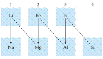 Ca urmare a celor doua tendinte importante din tabelul periodic - contractia straturilor de electroni de la stinga la dreapta perioadelor (cresterea electronegativitatii) si cresterea numarului de straturi de electroni in grupe de sus in jos (descresterea electronegativitatii) - se intimpla deseori ca un element sa aiba o raza atomica si raza ionica apropiate de ale elementului pozitionat mai jos pe diagonala decit elementele din propria grupa. Deoarece exista o serie de proprietati care sunt dependente de aceste raze si de valorile electronegativitatii, comportarea elementelor situate pe diagonala poate fi uneori asemanatoare. De exemplu, litiu se aseamana ca proprietati chimice cu magneziu mai mult decit ne-am astepta. Astfel de asemanari pot fi observate si in cazul altor perechi de elemente pozitionate similar.