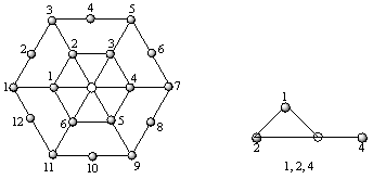 Pentru codarea sistemelor peri-condensate au fost propuse doua alternative [22, 36]. In prima alternativa se specifica prezenta inelelor benzenice (varfuri ale grafului dual) in zone concentrice in jurul unui centru topologic al sistemului hexagonal, acest centru nefiind specificat in notatie. Prima zona concentrica are numerele 1-6 in care 1 leaga partea de la suprafata stanga de centru printr-o linie orizontala iar a doua zona concentrica are numerele 1-12. Acest sistem este orientat astfel incat sa se minimizeze numerele in prima zona concentrica dupa anumite reguli bine precizate. Aceasta situatie in care sunt specificate inelele benzenice este prezentata in Figura 10.