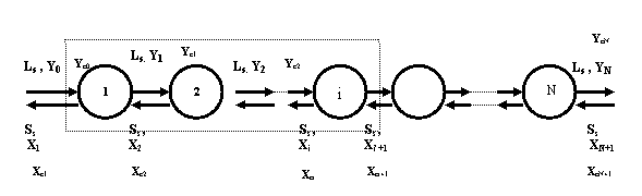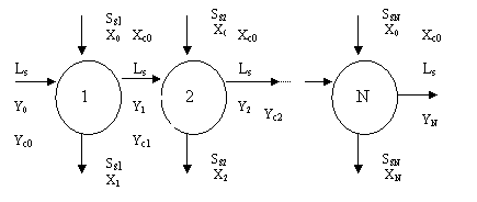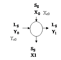 In figura 2.2 se prezinta modelul descriptiv al unitatii de schimb ionic cu contact unic. Se constata ca s-a optat pe cazul schimbului ionic monocomponent in care concentratiei ionului transferabil din fluid si respectiv in solid se s-a notat prin rapoartele molare (rapoartele masice) Y respectiv X. Prin Yc si Xc se noteaza concentratia contraionului in cele 2 faze. O problema de calcul a acestei contactari precizeaza debitul si compozitia fluidului supus indepartarii ionului ce se retine de schimbator , da reactia de schimb ionic si echilibrul de schimb, fixeaza randamentul de sorbtie din fluid si cere debitul de solid si compozitia fazelor dupa contactare ( Ss, Y1,Yc1,X1,Xc1). In modelul unitatii teoretice, dat mai jos, nu s-a considerat consumul contraionului in fluid ca urmare a unei interactiuni chimice. Solutionarea modelului de calcul mai sus formulat utilizeza urmatoarele relatii (expresii ):