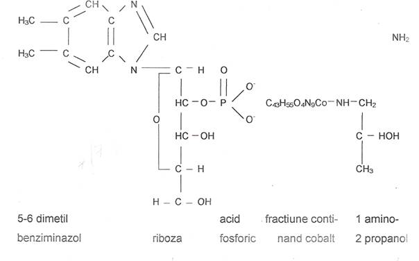 c) Contine in molecula un nucleu: 5-6 dimetilbenziminazol ,sub forma de combinatie glicozidica cu riboza, aceasta din urma este legata de o molecula de acid fosforic in carbonii 2 sau 3.