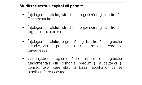 Am vazut deja, ca celor trei functii fundamentale ale statului - legislativa, executiva si jurisdictionala - le corespund trei categorii de organe, si anume: organele legislative, organele executive si organele judecatoresti sau jurisdictionale.