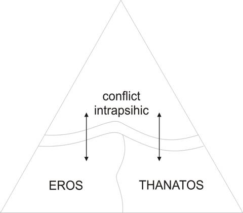 Conflictul intrapsihic dintre inconstient si constiinta impregneaza īntreaga viata a individului. Principiului placerii promovat de inconstientul axat pe viata animala se opune principiul realitatii promovat de constiinta centrata pe viata sociala , morala a omului generatoare de constrangeri firesti. Presiunile inconstientului asupra constiintei duc la manifestari morbide , la dramatice tulburari de echilibru sau la acte de comportament de neinteles, absurde sau ciudate.