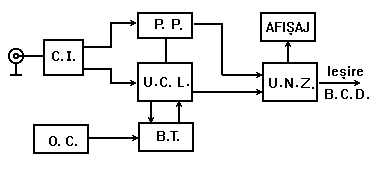 Circuitul de intrare (C.I) prelucreaza semnalul analogic de masurat intr-o succesiune de impulsuri dreptunghiulare de aceeasi frecventa cu cel de la intrare, carora li se pot asocia nivelele logice '0' si '1' dupa o anumita logica.