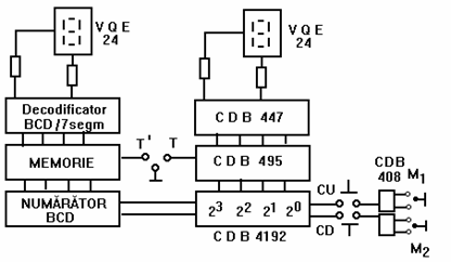 Decodoficatoarele NBCD- 7 segmente (CDB447) comanda cifrele afisoarelor VQE24 conform cu continutul numaratoarelor. Bistabilii realizati cu porti inversoare (CDB400) conectati pe intrarile C. U. si C. D. au rolul de a evita numararea unor impulsuri false.
