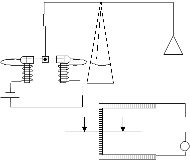Experimentul 1. Se realizeaza dispozitivul din fig.10.9,a. Cadrul mobil se leaga cu o ata de cârligul de sub taler unei balante, montata pe aceeasi tija cu suportul cadrului. Câmpul magnetic între piesele polare ale bobinelor este aproape uniform. Se echilibreaza balanta si se potriveste cadrul cadrul în pozitie orizontala, la aproximativ 1cm de marginea superioara a pieselor polare, astfel încât latura lui mobila sa fie între piesele polare (fig.10.9,b). Se alimenteaza cu tensiune continua bobinele si cadrul. Balanta se dezechilibreza datorita fortei electromagnetice exercitate de câmpul magnetic produs de bobine asupra laturii mobile a cadrului, parcursa de curent.Reechilibrând balanta cu etaloane de masa, se determina marimea fortei electromagnetice.