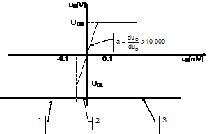 Figura 2 prezinta caracteristica de transfer ideala a unui AO. Regiunea de saturatie pozitiva s-a notat cu: |