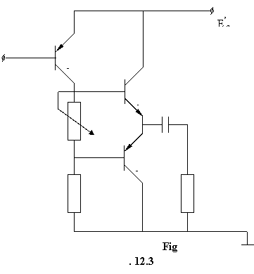Functionarea în clasa AB se poate realiza, de exemplu, sub forma din fig. 12.3, pentru un circuit cu o singura sursa de polarizare, în care sarcina se cupleaza prin capacitate. Prin rezistenta R circula curentul de colector al tranzistorului T3 , care asigura o cadere de tensiune de circa 1.2 -1.3 V la bornele ei, suficienta pentru mentinerea în conductie a tranzistoarelor T1 si T2 , în absenta semnalului ( tensiunea continua din emitoarele celor doua tranzistoare de putere se stabileste printr-o reactie negativa de curent continuu ). Rezistenta R1 asigura închiderea curentului de colector al tranzistorului T3 si contribuie la formarea sarcinii de colector a tranzistorului T3. Semnalul variabil se aplica pe baza tranzistorului T3.