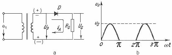 Schema electrica a acestui tip de redresor este redata în figura 2, a. Functionarea are loc astfel: la aplicarea unei tensiuni alternative în primar, ia nastere în secundar tot o tensiune alternativa, ce se aplica pe anodul diodei redresoare. Pe durata alternantelor pozitive dioda conduce, în circuit apare un curent proportional cu tensiunea aplicata, deci având aceasi forma cu ea. Pe durata alternantelor negative, dioda este blocata si curentul prin circuit este nul. Curentul prin sarcina circula deci întrun singur sens, sub forma unor alternante (curent pulsatoriu).