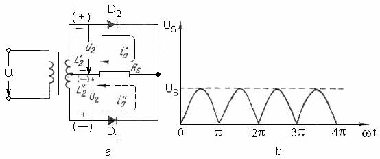 In figura 3-a este redata schema electrica a unui redresor dubla alternanta, la care tensiunea de alimentare se aplica printrun transformator având un secundar cu priza mediana legata la masa. Se observa ca schema contine doua redresoare monoalternanta, formate din: