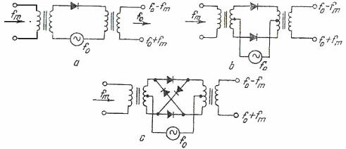 În figura 22,a se prezinta o schema cu o singura dioda, caruia i se aplica atât semnalul purtatoarei (F), din generatorul existent în secundar cât si semnalul util modulator (f) în primarul transformatorului. La iesire se obtin cele trei componente: F, F+f, F-f.