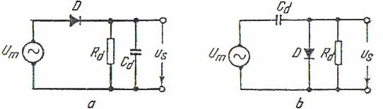 În figura 27 sunt reprezentate doua scheme mai raspândite de detectoare cu diode. Grupul RdCd reprezinta atât impedanta de sarcina a detectorului cât si un filtru trece-jos, condensatorul Cd fiind astfel ales ca valoare, încât permite obtinerea semnalului util, dar scurtcircuiteaza componentele de radiofrecventa. În multe cazuri, la iesirea circuitului se monteaza un filtru trece-jos suplimentar.