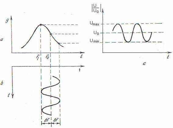 În figura 28 este reprodusa caracteristica unui circuit acordat derivatie (se presupune ca circuitul este acordat pe frecventa f ). Daca circuitului i se aplica un semnal modulat în frecventa de purtatoare f si amplitudinea constanta, atunci o data cu variatia frecventei (în limitele ±Δf), amplitudinea relativa a semnalului care se culege de la bornele sale variaza ca în figura 28,c (amplitudinea relativa reprezinta raportul dintre amplitudinea semnalului de iesire având o frecventa oarecare si cea corespunzatoare frecventei purtatoare).