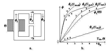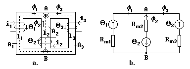 Fig. 10.3-4. Circuit magnetic (a) si schema sa echivalenta (b). |