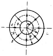 Armăturile condensatorului sunt două sfere concentrice de raze a, respectiv b (fig. 1.19), între care există un dielectric de permitivitate e. Fie q sarcina armăturii interioare de rază a. Aplicând legea fluxului electric unei suprafețe sferice de rază r (a<r<b) se obține: