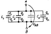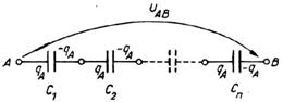 Fie un ansamblu de n condensatoare legate în serie (fig. 1.21). Tensiunea între A și B este suma tensiunilor condensatoarelor: