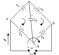 Fie q0 sarcina debitată de sursă, de asemenea necunoscută. Se stabilesc sensuri arbitrare de parcurgere a buclelor ca în figură.