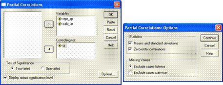 Pentru a fi sigur cu privire la relatia dintre variabilele care îl intereseaza, fara a suporta efectul celei de a treia, vom proceda la calcularea coeficientului de corelatie partiala, care se lanseaza în executie din meniul Statistics-Correlate-Partial, cu deschiderea casetei Partial Correlation, în care variabilele cercetate sunt trecute in lista Variables, iar variabila pe care dorim sa o izolam, în lista Controlling for: