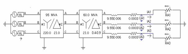 In anexa II.6 este prezentata schema instalatiei electrice a cuptorului cu arc electric si o modalitate de implementare a modelului bazat pe caracteristica dinamica in care lungimea arcului electric este constanta utilizand programul PSCAD-EMTDC.