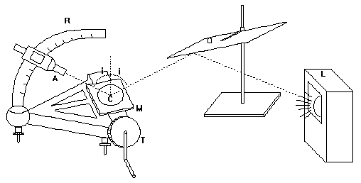 Montajul (fig. 3) este format dintr-un stativ pe care poate deplasata masuta M in directia orizontala cu ajutorul unui surub micrometric (cu pasul de 1 mm) prevazut cu un tambur gradat T, avand 200 diviziuni (o diviziune = 0,005 mm). Pe masuta este asezata o caseta C cu placa plana si lentila plan-convexa; 3 suruburi dispuse pe conturul casetei permit reglarea pozitiei punctului de sprijin al lentilei pe placa. Lumina este data de lampa L. Oglinda O trimite lumina asupra lentilei sub unghiul de incidenta i, iar inelele lui Newton pot fi observate sub acelasi unghi i cu ajutorul lunetei A . Pozitia lunetei poate fi reglata prin deplasarea pe raportorul R divizat in grade. Ocularul lunetei este prevazut cu un fir reticular.