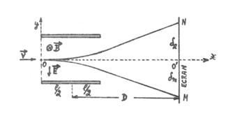 Electronii pot fi deviati de la traiectoria rectilinie si de catre un camp magnetic. Vom considera numai deviatia produsa de catre un camp electric perpendicular pe viteza initila a electronilor. Daca in aceeasi zona de lungime l va actiona un camp electric E constant, orientat asa cum se vede in fig. 1, perpendicular pe viteza initiala v, atunci asupra electronului va actiona forta constanta: