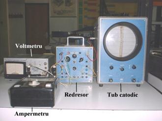 Tubul catodic este montat in cutia unui redresor, alimentat la reteaua de curent alternativ 220V, care asigura tensiunea de accelerare v=1000 V, precum si tensiunile necesare pentru reglajul focalizarii si intensitatii fasciculului de electroni. Aceste reglaje pot fi facute rotind butoanele c orespunzatoare de pe panoul frontal. Tensiunea pentru deviatia electrica, precum si curentul din solenoid sunt asigurate de un al doilea redresor alimentat tot de la reteaua de curent alternativ 220V, conform schemei din fig. 4.