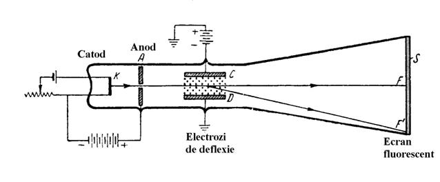 Sub actiunea unui filament incalzit electric, catodul "K" devine incandescent emitand electroni prin emisie termoelectronica. Electronii emisi sunt atrasi de anodul pozitiv A. Un numar de electroni scapa prin orificiul practicat in anod si isi continua drumul prin condensatorul C, pana la ecranul fluorescent E.
