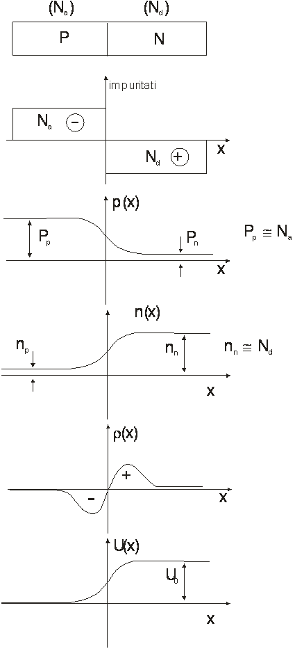 - jonctiunea pn este un semiconductor eterogen format din doua regiuni distincte dintre care una este dopata cu impuritati acceptoare iar cealalta cu impuritati donoare; cele doua regiuni formeaza o singura retea cristalina - doparea diferita se realizeaza prin procedee tehnologice adecvate.