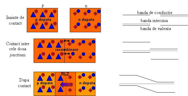 Sarcinile reprezentate cu triunghi albastru in partea stanga respectiv cu romb rosu in dreapta reprezinta ionii imobili ( donori, n, respectiv acceptori, p).