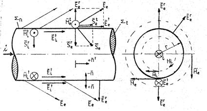 Fig. 6.5.1 Liniile câmpului electric si ale celui magnetic din interiorul si exteriorul conductorului |