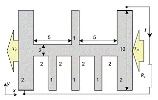 Celula de mai sus (subtire) este construita dintr-un material semiconductor (InSb) care este omogen, izotrop iar parametrii sai depind doar de temperatura. Fiecare celula este in contact cu o sursa calda (marginea din dreapta) si o sursa rece (marginea din
