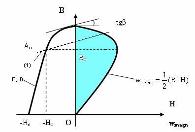 Dacǎ magnetul permanent apeleazǎ la un circuit magnetic exterior lui, punctul optim de functionare se deplaseazǎ din Ao, pe dreapta de revenire, o paralelǎ prin Ao, la tangenta la caracteristica B(H), in punctul de intersectie al acesteia cu axa ordonatelor, de coordonate (0,Br), cu panta tgβ.