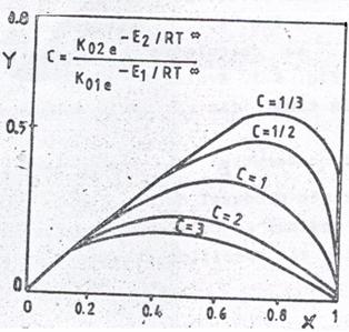 Figura 6.4 Dependenta randament-conversie în cazul reactiilor consecutive (E1>E2)