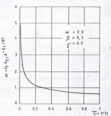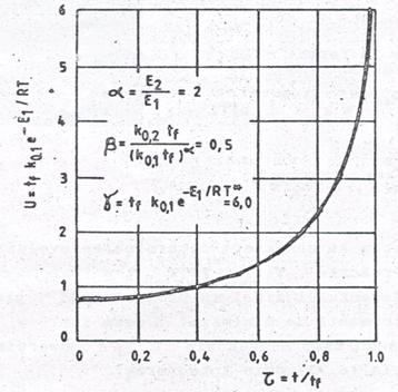 Expresia (6.48) permite calculul evolutiei in timp a conversiei in conditiile temperaturii optime de reactie. Exemplu numeric: