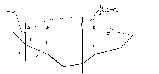gi, gi+1 sunt debitele partiale tarate transportate de rau in verticala i pe latimea b a batometrului [g/m s]; li, distanta dintre verticalele i si i+1.