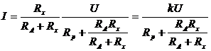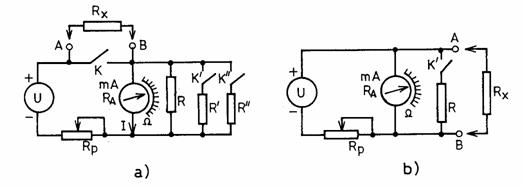 In primul caz este vorba de o schema de tip serie. Curentul I din bobina miliampermetrului, cu intrerupatorul K deschis si cu rezistorul Rx conectat la bornele A si B, este determinat de expresia: