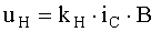Efectul Hall consta in producerea unei tensiuni UH (tensiune Hall) transversale intr-o placuta din material semiconductor, parcursa de un curent longitudinal de comanda iC si aflata intr-un camp magnetic cu inductia perpendiculara pe suprafata placii (fig.7). Se folosesc ca materiale semiconductoare cristale de InSb, InAs, HgTe, HgSe. Tensiunea Hall are valoarea: