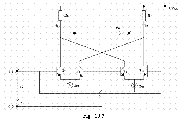 Cuplajul la tensiunea v1 a circuitului RLC se face prin condensator pentru a nu afecta functionarea īn curent continuu a tranzistorilor T3 T4 sau T5 T6 .
